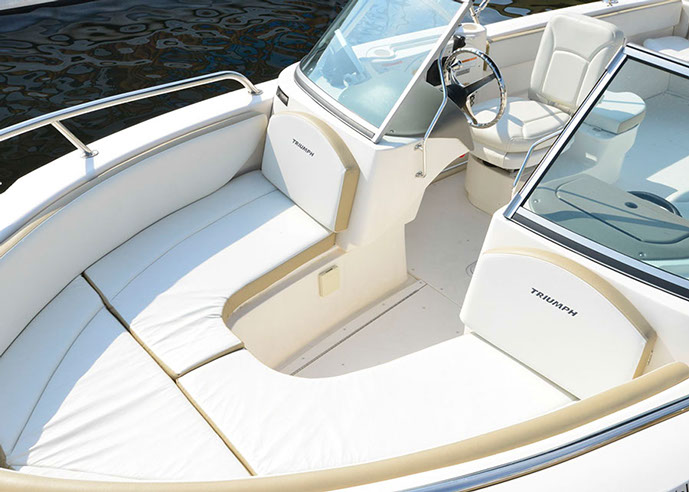 Triumph made a gem of a family cruise boat with the 19 foot dual console. This boat is great for families with children because there is plenty of cozy, comfortable seating. You'll enjoy how kid friendly it is. While docked or anchored parents can park in the console seats and kids can circulate back and forth in the center of the boat. This boat is so popular we have 2 of them!
